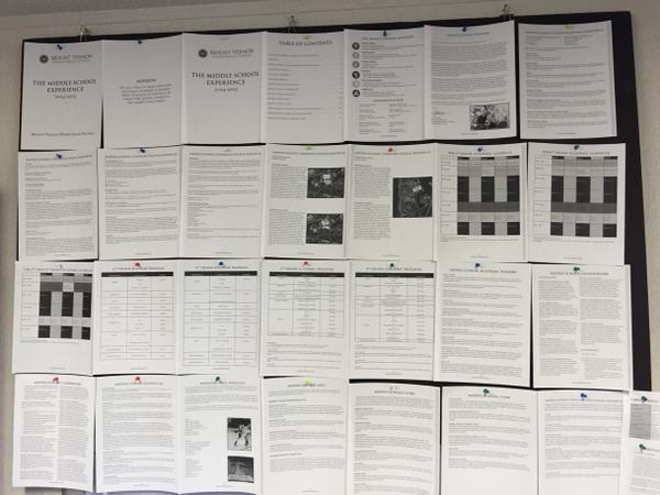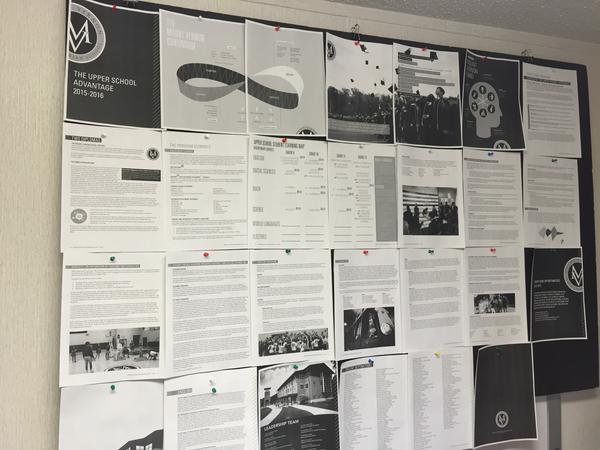 Our team is beginning the process of iterating the Middle School Experience booklet. We are using boards to lay out all of the pages and comparing notes with the Upper School Advantage booklet for new design ideas. We need less text. More images. Easier navigation with clearer headings and groupings. More color. More relevant info. Stay tuned… (For a color, pdf version of the MS Experience visit our website)